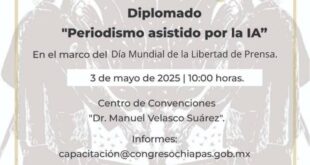 + Representantes de los medios de comunicación*: Te extendemos una cordial invitación a participar en el *Diplomado «Periodismo asistido por la IA»*, una iniciativa conjunta del *Congreso del Estado de Chiapas* y la *Universidad Autónoma de Chiapas*, diseñada especialmente para ti. Este diplomado tiene como objetivo *fortalecer tus habilidades en …