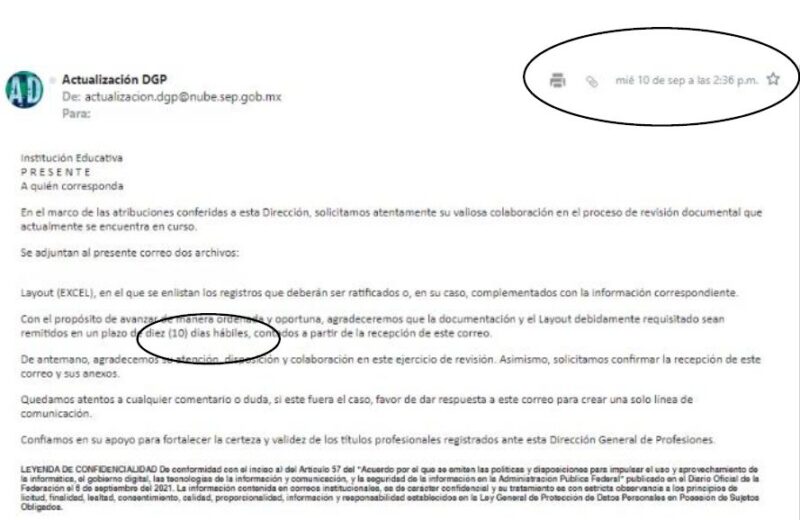 A la falta de claridad se suma un patrón que las universidades califican de irregular: los oficios llegan con fechas manipuladas o retroactivas, de modo que los plazos legales vencen incluso antes de que el correo sea recibido y, en algunos casos, el correo menciona 10 días para responder, pero el documento anexo marca 5; en otros, la notificación llega después de expirado el plazo.