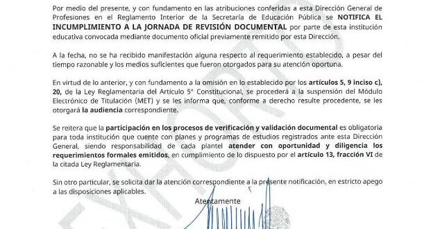 Paradójicamente, al final de cada oficio, después de la amenaza de bloqueo, aparece una frase recurrente donde prácticamente se les dice “tiene usted derecho de audiencia y podemos platicar”, porque ese es el mensaje del exhorto que dice: “se procederá a la suspensión del Módulo Electrónico de Titulación (MET) y se les informa que conforme a derecho resulte procedente, se les otorgará la audiencia correspondiente”, firmado por Israel Jerónimo López, director de Autorización y Registro Profesional. Para las universidades, esta frase ilustra el doble discurso institucional: primero se paralizan los trámites y después se ofrece un diálogo tardío, condicionado y carente de efectos reales.