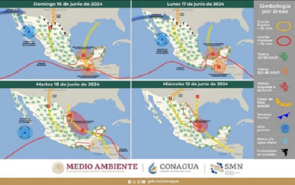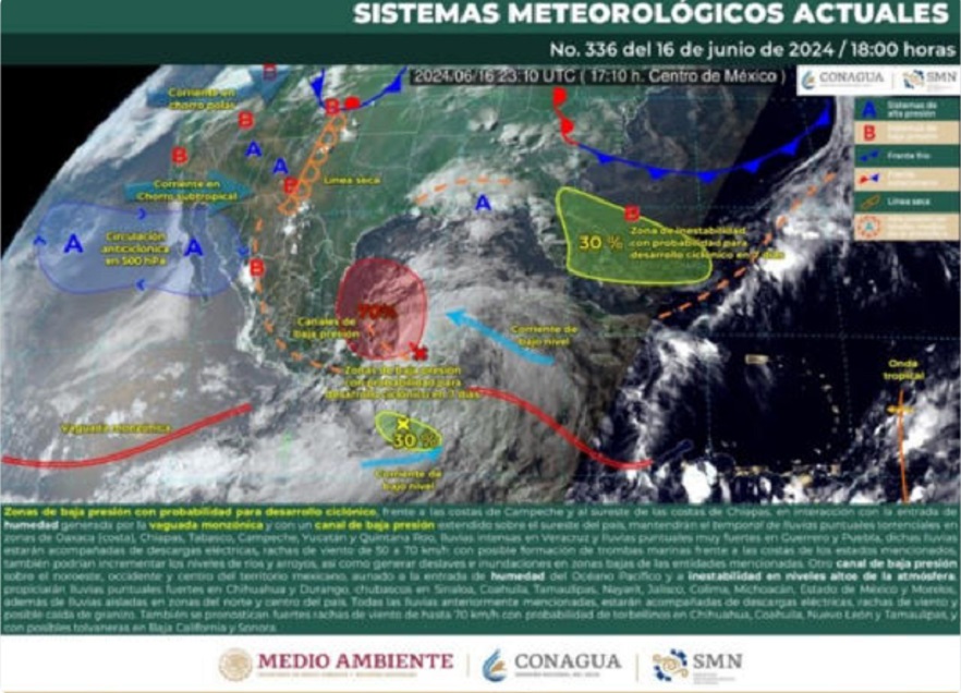El organismo pronosticó que, para este lunes 17 de junio, continuará el temporal de lluvias en el sureste y oriente de México, así como en la península de Yucatán, favorecido por las zonas de baja presión con potencial ciclónico, la primera sobre el suroeste del golfo de México y la segunda al sureste de las costas de Chiapas.