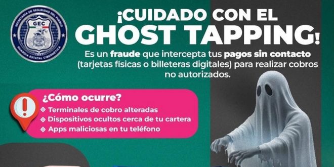 TUXTLA GUTIERREZ, Chiapas; 15 de febrero de 2026.- La Secretaría de Seguridad del Pueblo (SSP), que encabeza Óscar Alberto Aparicio Avendaño, a través de la Guardia Estatal Cibernética, alerta a la ciudadanía sobre una nueva modalidad de fraude denominado “Ghost Tapping”, que permite realizar cargos no autorizados en tarjetas bancarias.