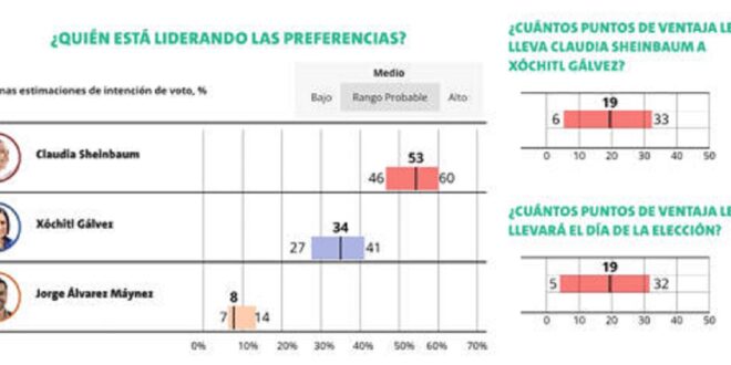 CIUDAD DE MEXICO, 29 de mayo de 2024./Expansión Política • Expansión.- México tendrá una mujer en la Presidencia en 2024. Así lo refleja la Encuesta de Encuestas de Expansión Política , en la que la candidata de la coalición Sigamos Haciendo Historia, Claudia Sheinbaum, aventaja con 19 puntos a la abanderada de la alianza Fuerza y Corazón por México, Xóchitl Gálvez . Al 29 de mayo, el modelo posicionó a Sheinbaum en la delantera con aproximadamente 53% de las intenciones de voto ; seguida de Gálvez, quien tiene 34% de la intención del voto , y Jorge Álvarez Máynez , de Movimiento Ciudadano, con 8%. Lee : Ubica tu casilla del INE