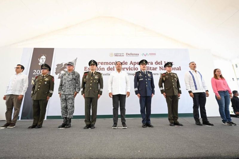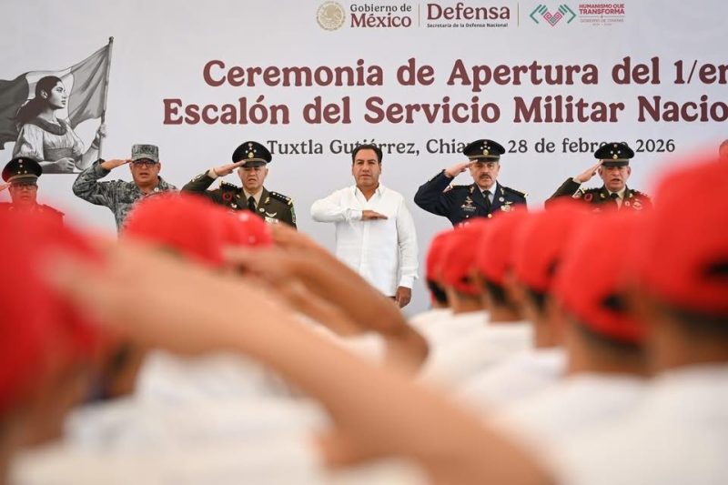TUXTLA GUTIERREZ, Chiapas, 28 de febrero de 2026.- El gobernador Eduardo Ramírez Aguilar, junto a autoridades militares y civiles, atestiguó la ceremonia de apertura del Primer Escalón 2026 del Servicio Militar Nacional (SMN), realizada en el Parque Bicentenario de Tuxtla Gutiérrez.