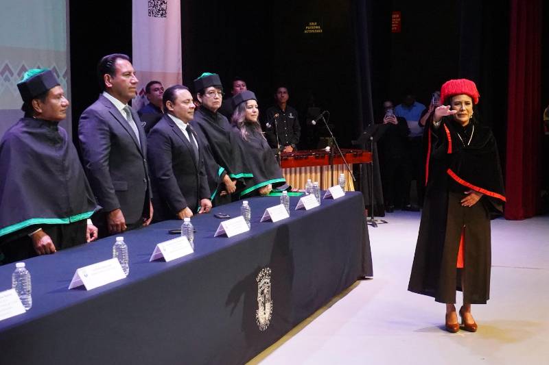 La rectora, luego de rendir protesta de ley ante la comunidad universitaria, agradeció al gobernador de Chiapas su presencia y apoyo, el cual es “coincidente con la nueva era que encabeza, enarbolando el humanismo transformador como filosofía para alcanzar el buen vivir del que hablan los pueblos originarios y que le dan raíz y razón a nuestra identidad”.