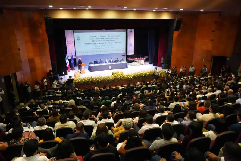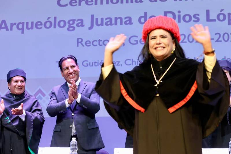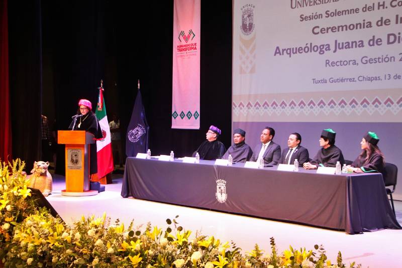 TUXTLA GUTIERREZ, Chiapas, 13 de febrero de 2025.- En sesión solemne realizada en el Teatro Universitario, la arqueóloga Juana de Dios López Jiménez fue investida por el Consejo Universitario como rectora de la Universidad de Ciencias y Artes de Chiapas (Unicach), para el periodo 2025-2029.