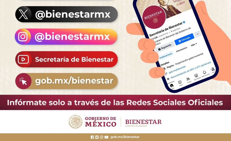 Facebook: bienestar.mx; X antes Twitter: @bienestarmx; Youtube: Secretaría de Bienestar; Instagram: bienestarmx, así como a través de la Línea de Bienestar: 800 639 42 64.