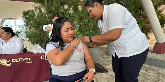 TUXTLA GUTIERREZ, Chiapas, 13 de febrero de 2026.- Con el propósito de fortalecer el bienestar de su base trabajadora, el Colegio de Estudios Científicos y Tecnológicos del Estado de Chiapas (Cecytech) llevó a cabo una Jornada de Vacunación en coordinación con la Secretaría de Salud (SS), como parte de las acciones orientadas al cuidado integral del personal que diariamente contribuye a la formación académica en la entidad.