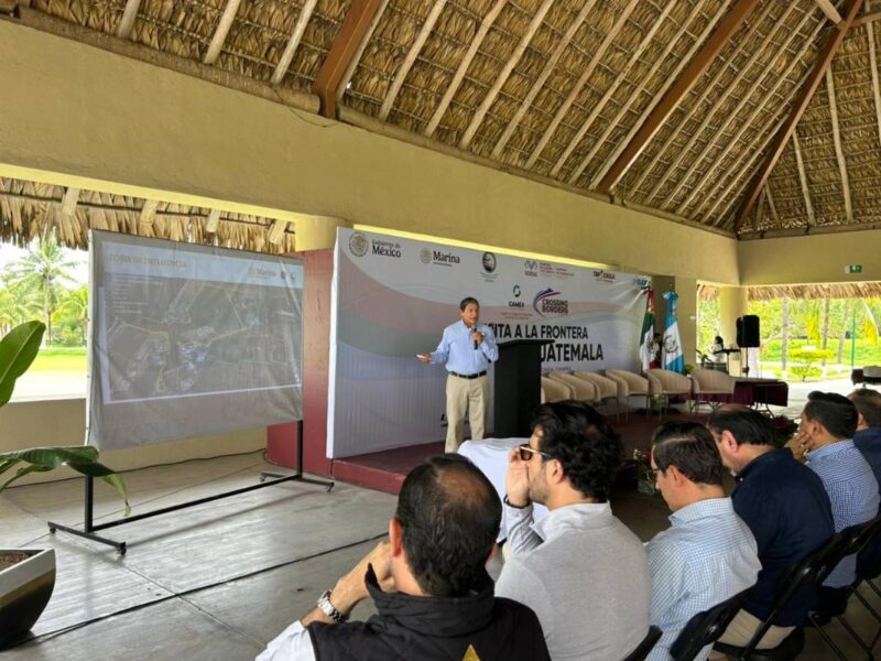 TUXTLA GUTIERREZ, Chiapas, 03 de octubre de 2025.- El Secretario de Economía y del Trabajo (SEyT), Luis Pedrero González; participó en el foro Visita a la Frontera México-Guatemala realizado en Puerto Chiapas, donde se abordaron temas como el papel estratégico de Puerto Chiapas y su conexión con el Tren Interoceánico hacia Guatemala, mismo que representa un proyecto de gran impacto para el sur-sureste de México, destinado a impulsar el desarrollo económico y social de la región.