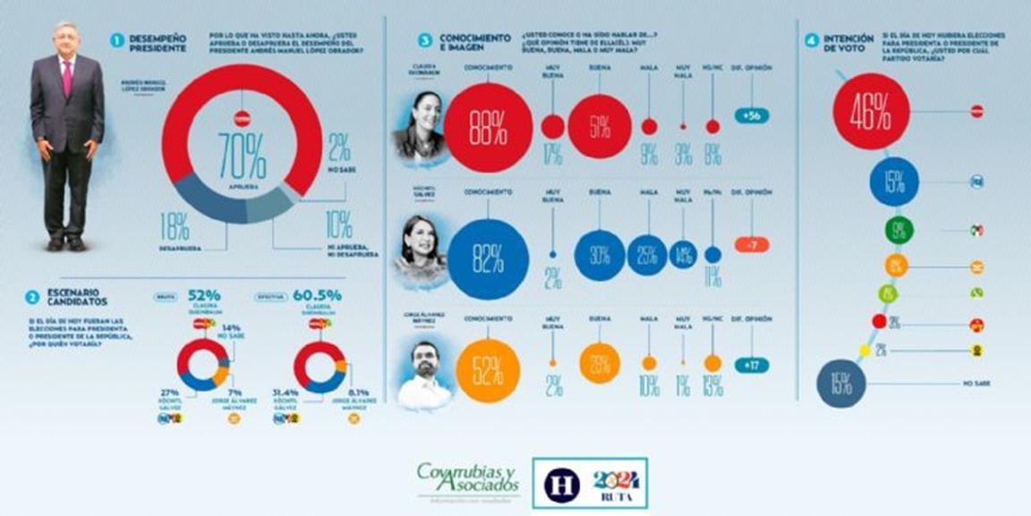 A la pregunta de “si el día de hoy fueran las elecciones para Presidenta o Presidente de la República, ¿por quién votaría?”, la exjefa de Gobierno de la Ciudad de México, Claudia Sheinbaum, obtuvo 60.5 por ciento de respaldo ciudadano efectivo.