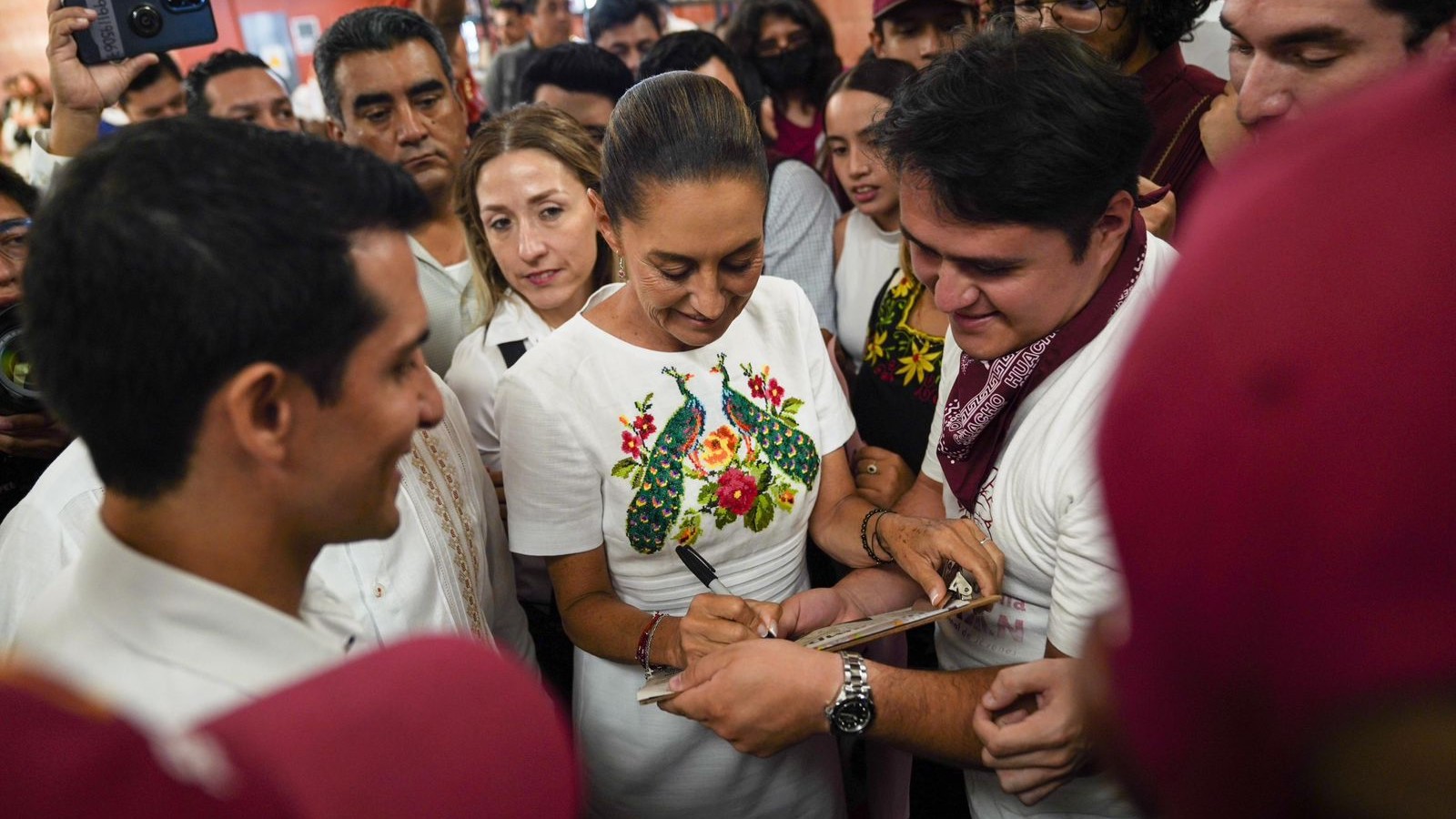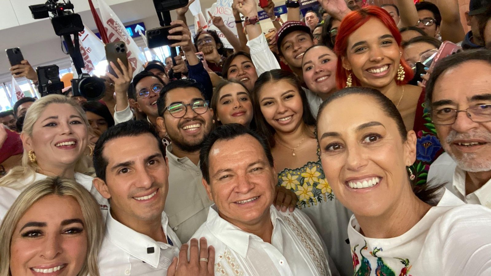 Quienes se dieron cita en el aeródromo de la entidad aprovecharon para dar muestras de su apoyo rumbo a las próximas elecciones del 2 de junio con abrazos, carteles, así como algunos obsequios como una blusa con bordados tradicionales.
