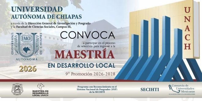 TUXTLA GUTIÉRREZ, Chiapas, 18 de enero de 2026.- La Benemérita Universidad Autónoma de Chiapas tiene abierta la convocatoria para formar parte de la 9a. Promoción de la Maestría en Desarrollo Local 2026-2028.