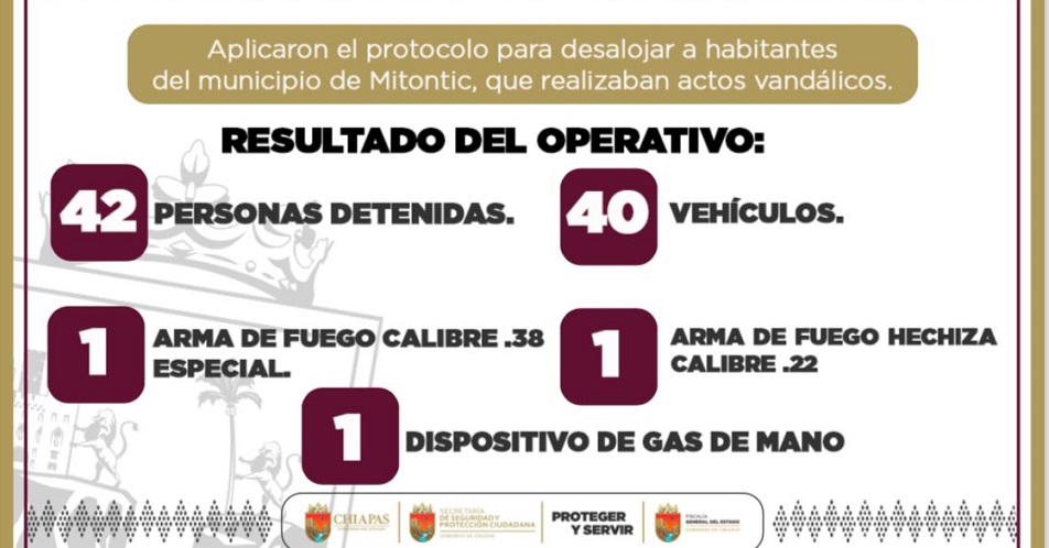 Las 42 personas detenidas, las armas de fuego y los vehículos asegurados fueron puestos a disposición de la autoridad ministerial a fin de esclarecer los hechos y deslindar responsabilidades, bajo las políticas de cero impunidad a cualquier conducta delictiva.