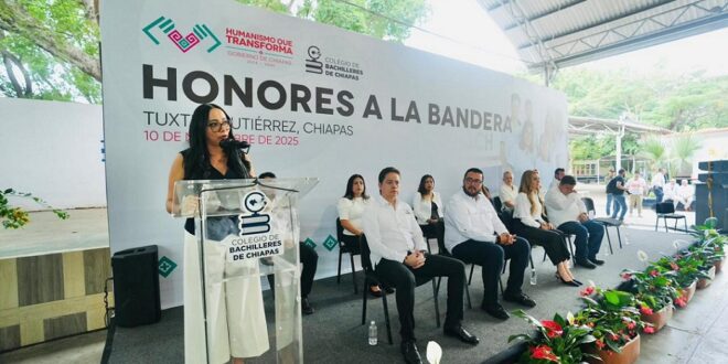 “En el Cobach trabajamos con transparencia, enfocados en consolidar un modelo educativo incluyente, humanista y cercano a la gente, pero también fortaleciendo cada acción con responsabilidad y sentido ético”, mencionó la titular de este subsistema en su mensaje dirigido a asistentes que se dieron cita en el plantel 13 Tuxtla Oriente, donde se llevó a cabo el homenaje al lábaro patrio.