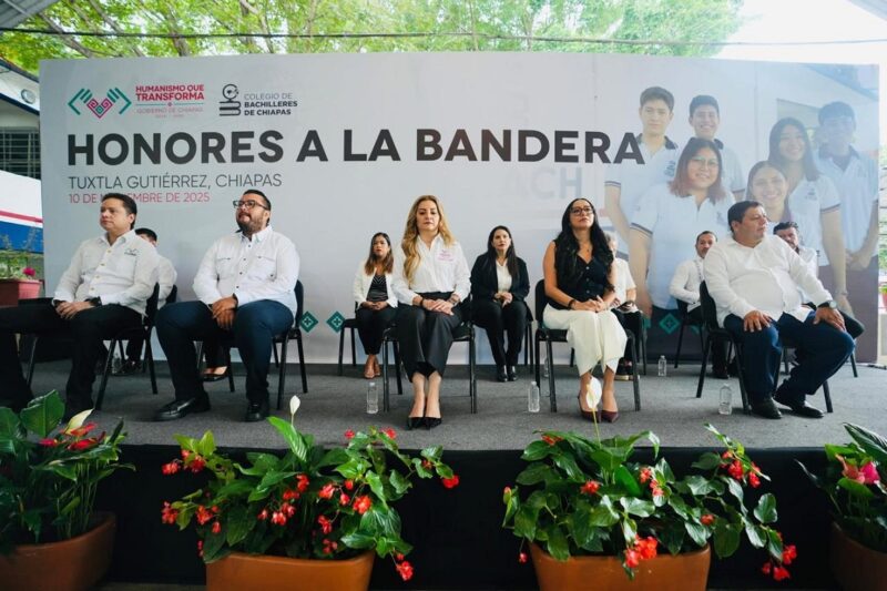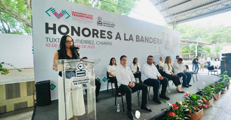 TUXTLA GUTIÉRREZ, Chiapas; 10 de noviembre de 2025.- Con el respaldo de autoridades estatales y junto a la comunidad estudiantil, personal docente y administrativo de planteles, coordinaciones de zona y oficinas centrales, la directora general del Colegio de Bachilleres de Chiapas (Cobach), Viridiana Figueroa García, encabezó este lunes la ceremonia de honores a la bandera, donde reiteró el compromiso institucional de trabajar en esta Nueva ERA educativa con transparencia, honestidad y sentido de compromiso, bajo la directriz del gobernador Eduardo Ramírez Aguilar.