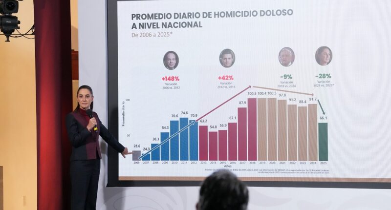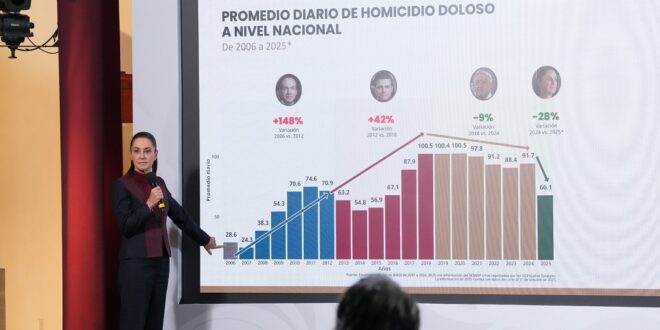 Destacó que, de 2006, último año de Vicente Fox, al 2012, último de Felipe Calderón, los homicidios dolosos aumentaron en 148 por ciento, como resultado de la llamada “guerra contra el narco” y de igual forma, del último año de Calderón al último de Enrique Peña Nieto, incrementaron en 42 por ciento. Mientras que, del último año de Peña al último del expresidente Andrés Manuel López Obrador en 2024, la reducción en este delito fue de 9 por ciento. Y al 31 de octubre de 2025, la disminución es del 28 por ciento. Por ello, puntualizó, con la Cuarta Transformación cambió la estrategia y se están dando resultados.