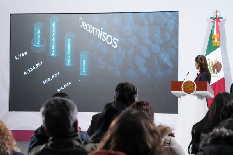 El secretario de Seguridad y Protección Ciudadana, Omar García Harfuch, informó que, del 1 de octubre de 2024 al 31 de octubre 2025, se han detenido a 37 mil 12 personas por delitos de alto impacto, se han asegurado 18 mil 981 armas de fuego, se incautaron cerca de 300 toneladas de droga, incluyendo cuatro millones de pastillas de fentanilo y se desarticularon y desmantelaron mil 614 laboratorios clandestinos y áreas de concentración.