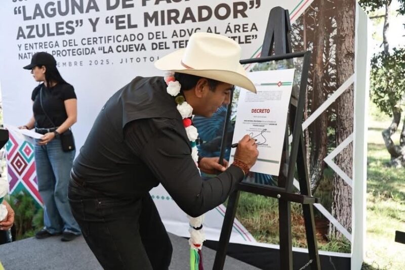 JITOTOL. Chiapas, 29 de noviembre de 2025.- El gobernador Eduardo Ramírez Aguilar encabezó la firma del Decreto de Declaratoria de Áreas Naturales Protegidas con la categoría de Zona Sujeta a Conservación Ecológica para los territorios Laguna de Pájaros Azules y El Mirador, y entregó el certificado de Área Destinada Voluntariamente a la Conservación (ADVC) del Área Natural Protegida La Cueva de Tepezcuintle, en el municipio de Jitotol.