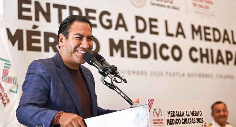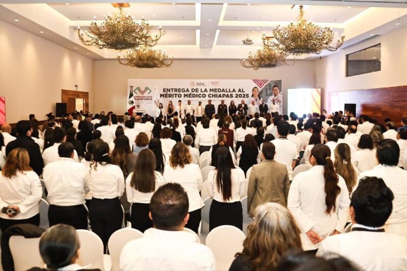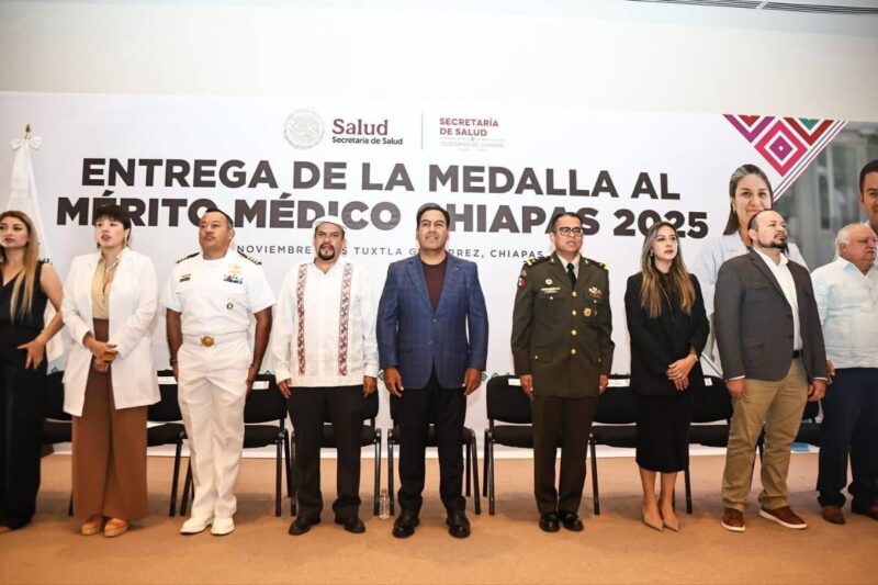 TUXTLA GUTIERREZ, Chiapas, 14 de noviembre de 2025.- El gobernador Eduardo Ramírez Aguilar encabezó la entrega de la Medalla al Mérito Médico Chiapas 2025 al doctor Salvador Pacheco Segura, a quien describió como un hombre íntegro y patriota que, mediante su labor, llevó esperanza y mejor calidad de vida a la población más necesitada en distintas regiones del estado.
