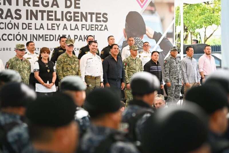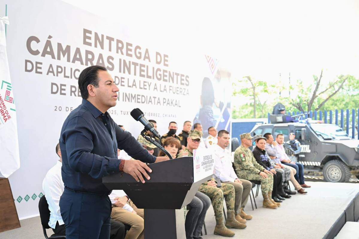 TUXTLA GUTIERREZ, Chiapas, 20 de octubre de 2025.- Durante la entrega de cámaras inteligentes y vehículos blindados a la Fuerza de Reacción Inmediata Pakal (FRIP), el gobernador Eduardo Ramírez Aguilar destacó que la seguridad es una de las principales prioridades del gobierno de la Nueva ERA, por lo que se ha realizado una importante inversión en equipamiento, unidades terrestres y aéreas, herramientas tecnológicas e inteligencia operativa, con el objetivo de contar con una policía preparada y altamente profesional al servicio del pueblo de Chiapas.