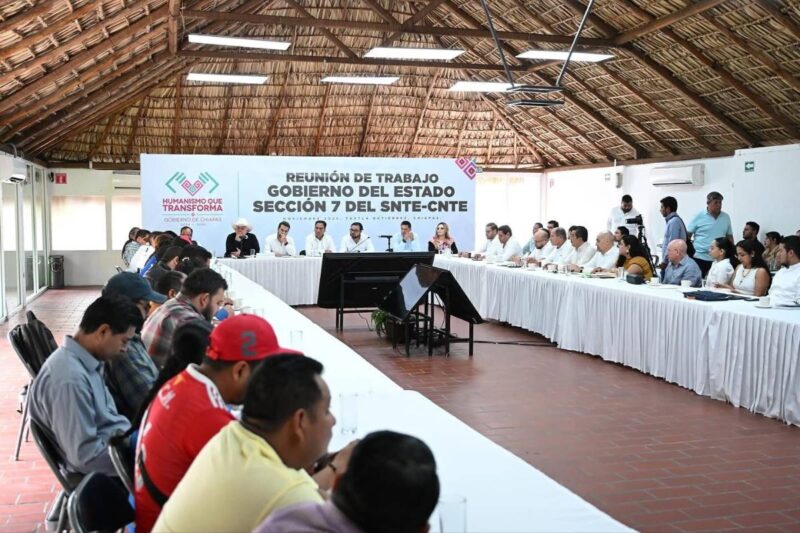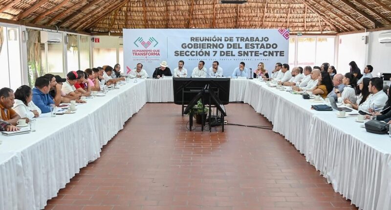 TUXTLA GUTIERREZ, Chiapas, 13 de noviembre de 2025.- El gobernador Eduardo Ramírez Aguilar sostuvo una reunión de trabajo con integrantes de la Sección 7 del SNTE-CNTE Chiapas, en la que escuchó con atención sus planteamientos. Acompañado por los secretarios de Educación, Roger Mandujano Ayala, y de Finanzas, Manuel Antonio Pariente Gavito, el mandatario refrendó la disposición de su gobierno para trabajar de manera conjunta y atender las necesidades del magisterio chiapaneco, dentro del ámbito de sus competencias y atribuciones.