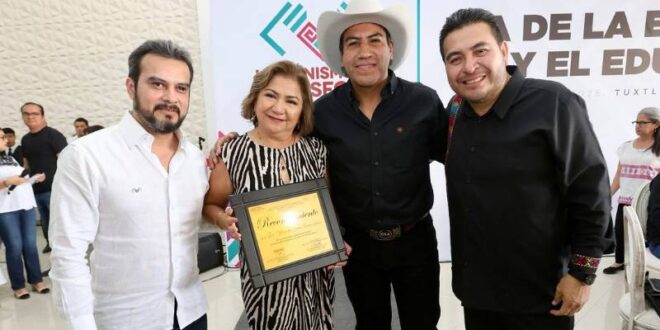 Como parte de la celebración, se hizo entrega de reconocimientos a las y los educadores María de Lourdes Conde Ruiz, jefa de Sector jubilada; Hermelinda Montesinos León, jefa del Sector 10 de Pichucalco; Freddy Renaud Solar González, director del Sector 12, zona 059, Jardín de Niños “Andrés Fábregas Roca” de Las Cruces, del municipio de Acapetahua y Ana Marisol Coutiño Villanueva, docente jubilada.