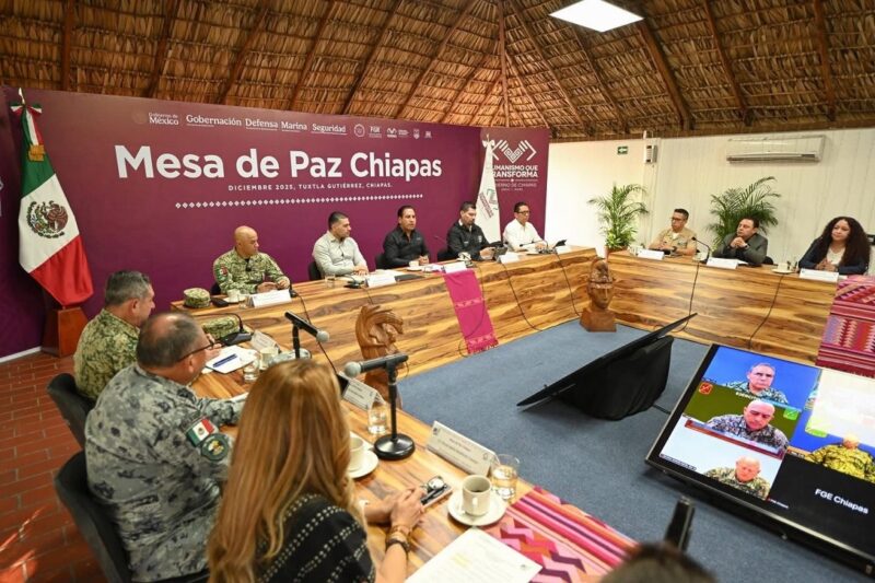 TUXTLA GUTIERREZ, Chiapas; 16 de diciembre de 2025.- Con la presencia del secretario de Seguridad y Protección Ciudadana del Gobierno de México, Omar García Harfuch, el gobernador Eduardo Ramírez Aguilar encabezó la Mesa de Paz, espacio en el que agradeció el respaldo otorgado a Chiapas para hacer frente a la violencia. En ese marco, también externó su reconocimiento a la presidenta Claudia Sheinbaum Pardo por su compromiso y acompañamiento permanente, lo cual, afirmó, ha permitido avanzar de manera decidida en el proceso de pacificación del estado.