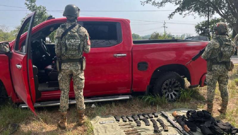 -En Mapastepec, elementos del Ejército Mexicano localizaron un vehículo abandonado, donde aseguraron dos armas largas, un arma corta, 15 cargadores, 387 cartuchos y dos chalecos tácticos.