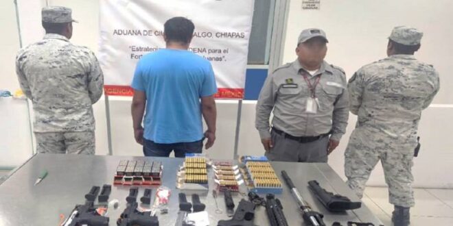 -En Huixtla, elementos de la Guardia Nacional (GN) y Aduanas, al realizar una inspección en el Centro de Atención Integral al Tránsito Fronterizo, Huixtla, detuvieron a una persona, asegurándole un arma larga, tres armas cortas, seis cargadores, 1,250 cartuchos y dos silenciadores.