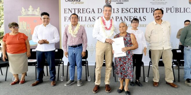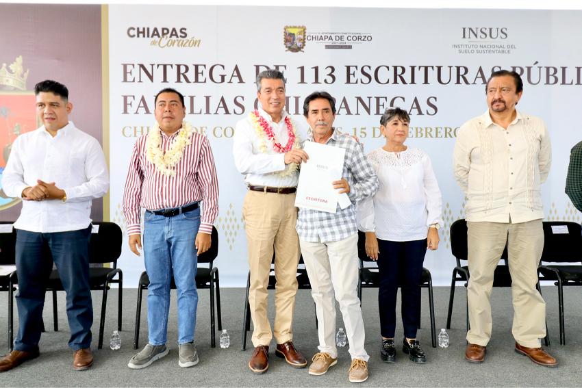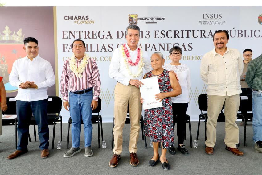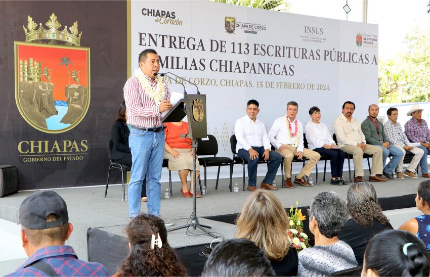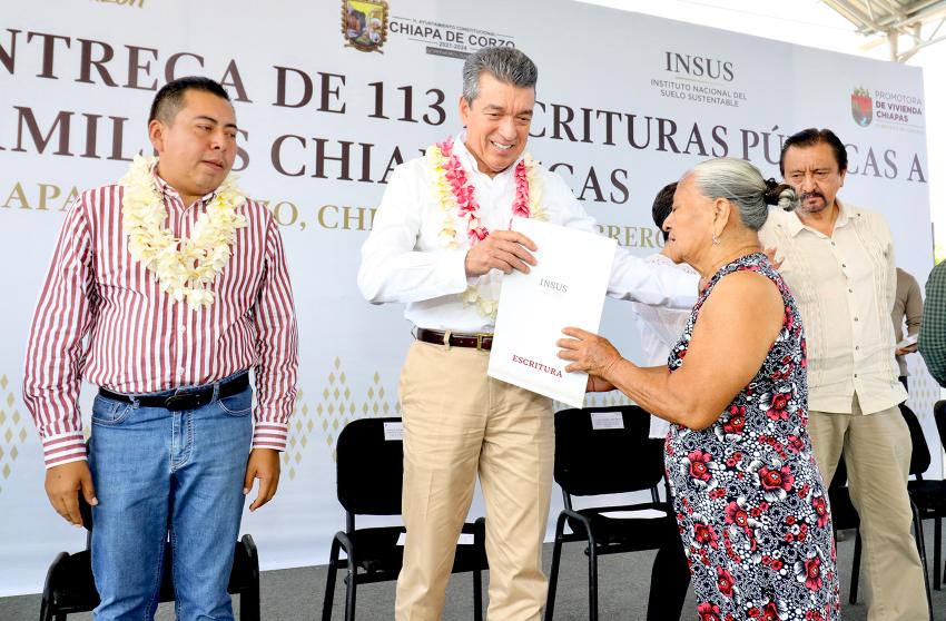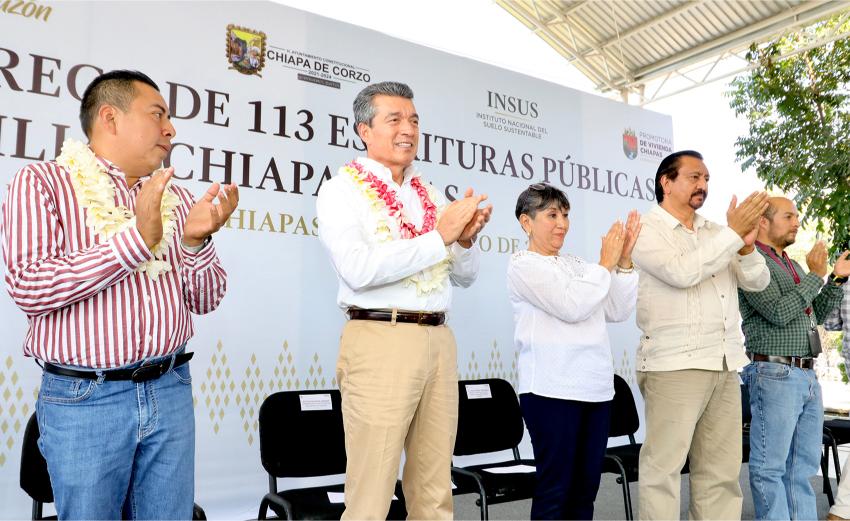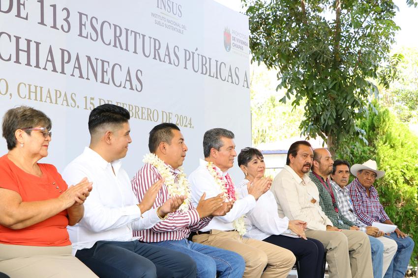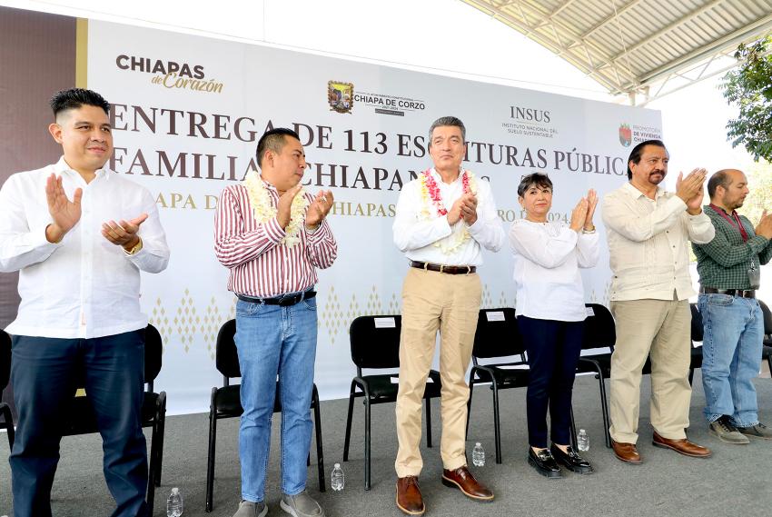 En tanto, la directora general de la Promotora de Vivienda Chiapas, Rosa Marbel Vera Mejía, señaló que esta ocasión se distribuyeron 113 escrituras públicas, documento que además de dar certeza jurídica patrimonial, también facilita el acceso a programas de mejoramiento de vivienda, créditos hipotecarios y trámites testamentarios, entre otros beneficios.