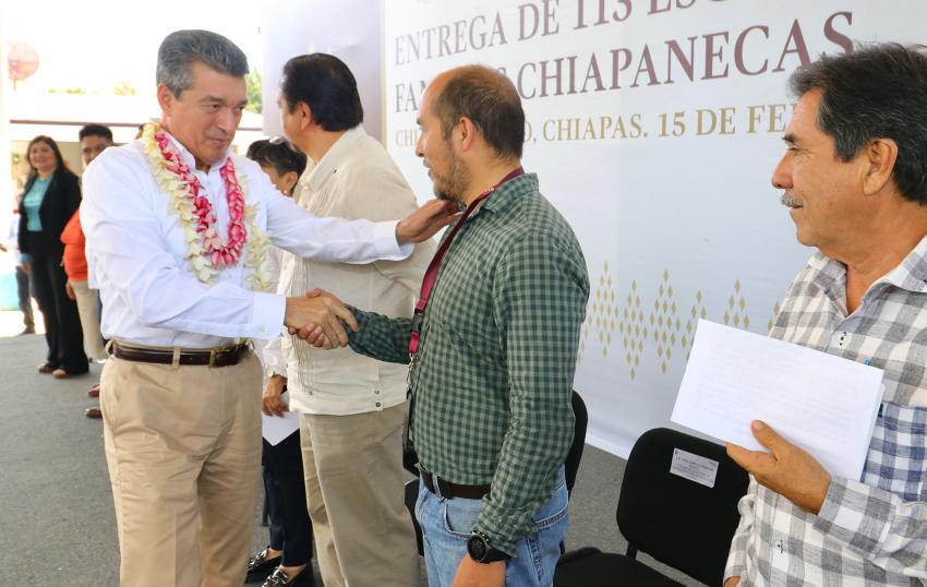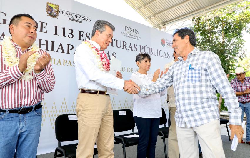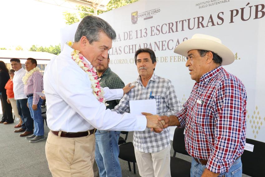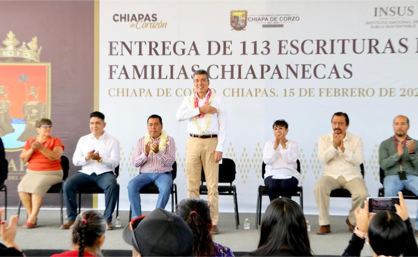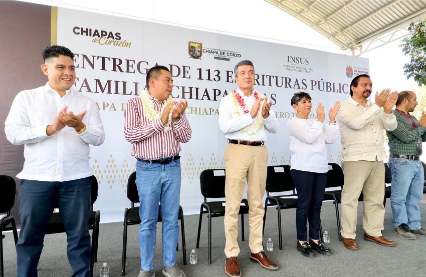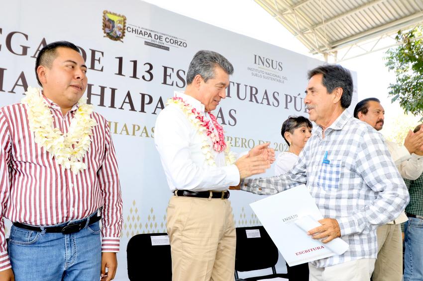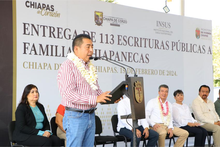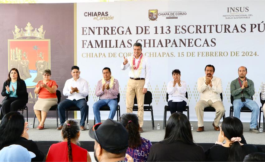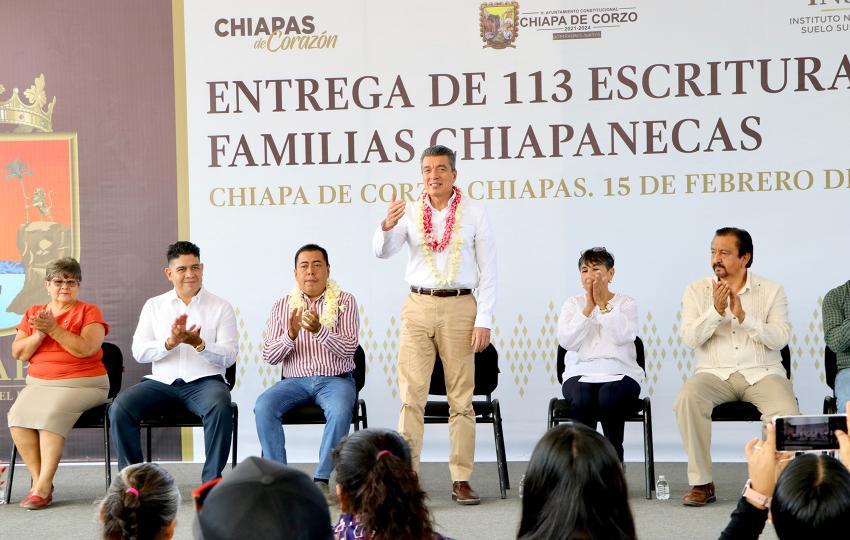 Finalmente, el alcalde de Chiapa de Corzo, Leonardo Cuesta Ramos, reconoció al gobernador por ser promotor de la justicia e impulsor del desarrollo social y económico de la entidad, y expresó que con esta entrega se da bienestar a 113 familias. Refrendó su compromiso de hacer lo que le corresponde para avanzar en la regularización de la tenencia de la tierra, ya que con ello se puede llevar más obra pública y apoyos a la población.