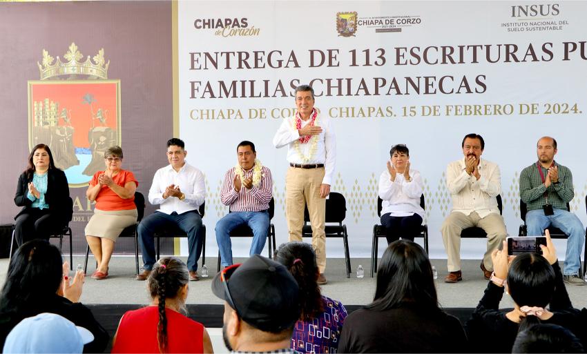TUXTLA GUTIÉRREZ, Chiapas; 15 de febrero de 2024.- Durante la entrega escrituras públicas a 113 familias de los municipios de Tuxtla Gutiérrez, Chiapa de Corzo y San Cristóbal de Las Casas, el gobernador Rutilio Escandón Cadenas destacó que otorgar este documento no es una dádiva ni una concesión, sino un acto de justicia social y de certeza jurídica para las personas, quienes, en algunos casos, tuvieron que esperar hasta 40 y 50 años.