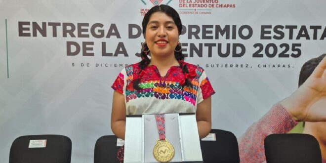 TUXTLA GUTIÉRREZ, Chiapas, 07 de diciembre de 2025.- Esmeralda Guadalupe Pérez Chulín, estudiante del Colegio de Estudios Científicos y Tecnológicos del Estado de Chiapas (Cecytech), Plantel número 21 del municipio de Bochil, obtuvo el Premio Estatal de la Juventud 2025 en la Categoría de Expresiones Artísticas y Artes Populares, tras ser reconocida por su cuento “El viaje de Rulo”, distinción que reafirma el talento creativo y académico de la juventud chiapaneca.