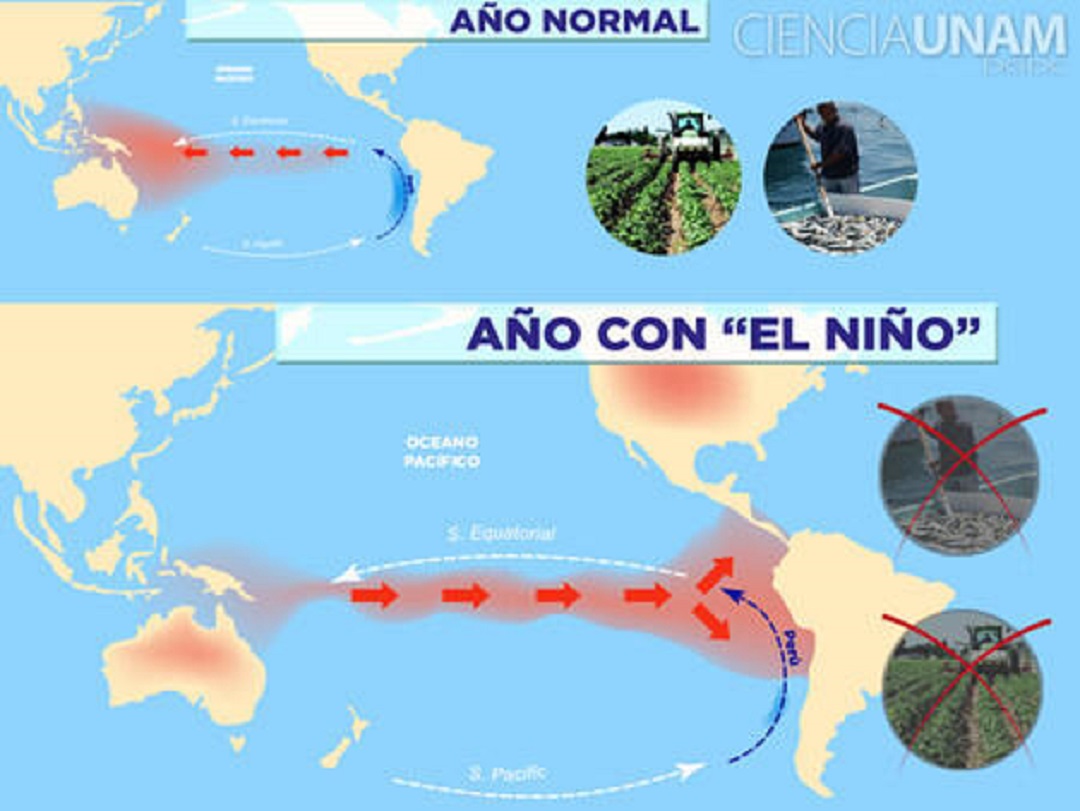 En el caso de México, cuando existe «El Niño», los vientos hacen que el agua cálida del oeste del Pacífico se desplace a lo largo de la línea ecuatorial. Al haber más agua cálida al este, la atmósfera se vuelve inestable, generando humedad, formación de nubes y lluvias, y fomentando la formación de más huracanes en la costa oeste del país.