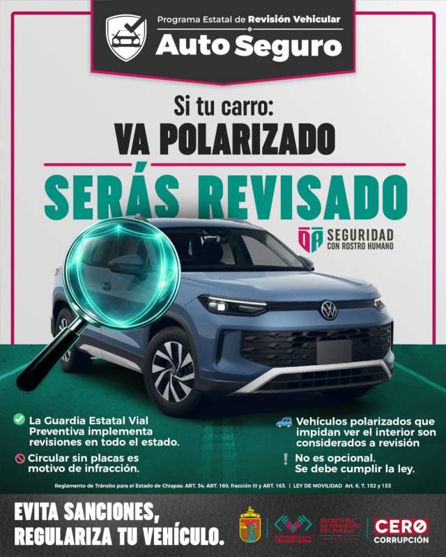 TUXTLA GUTIÉRREZ, Chiapas; 07 de marzo de 2026.- En el marco del Programa Estatal de Revisión Vehicular “Auto Seguro”, la Secretaría de Seguridad del Pueblo (SSP) que encabeza Óscar Alberto Aparicio Avendaño, a través de la Guardia Estatal Vial Preventiva, invita a la ciudadanía a retirar el polarizado de sus vehículos particulares, así como del servicio público con el objetivo de garantizar un entorno vial ordenado y seguro.