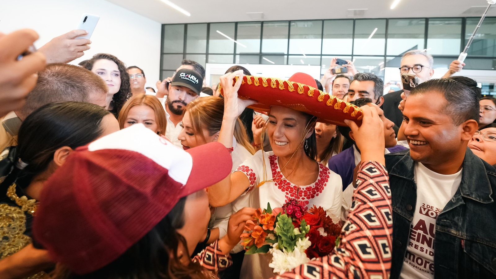 Guadalajara, Jalisco a 14 de mayo de 2024.- Con porras como “Es un honor, estar con Claudia hoy” y “Presidenta”, las y los jaliscienses recibieron a la candidata de la coalición “Sigamos Haciendo Historia” (Morena, PT y PVEM) a la Presidencia de México, Claudia Sheinbaum, en el aeropuerto de Guadalajara, previo a los eventos que tendrá este día como parte de su gira por la entidad.