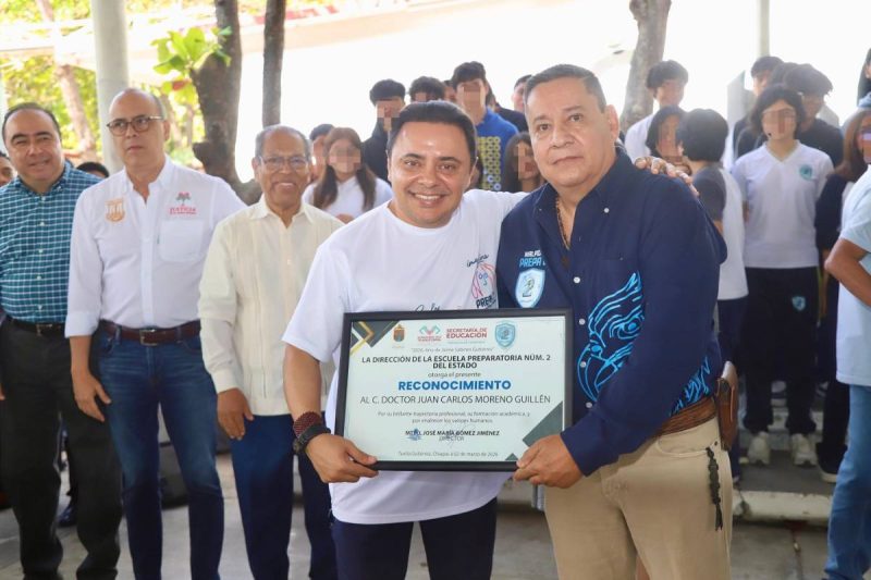 TUXTLA GUTIERREZ, Chiapas; 02 de marzo de 2026.- El magistrado presidente del Poder Judicial del Estado de Chiapas, Juan Carlos Moreno Guillén, participó en la ceremonia cívica de Honores a la Bandera en la Preparatoria No. 2 de Tuxtla Gutiérrez, en el marco del programa “El Tribunal va a tu Escuela”, una iniciativa que ha impulsado para fortalecer el vínculo entre la casa de la justicia y la comunidad estudiantil.