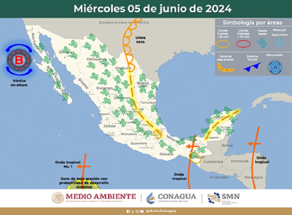 El SMN explica que esto será debido a una circulación anticiclónica en niveles medios de la atmósfera que se debilitará. No obstante, según el pronóstico, persistirá el ambiente caluroso a muy caluroso, así como las altas temperaturas de la temporada sobre gran parte del país.