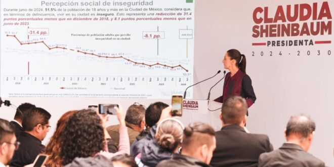 “En el caso de la Ciudad de México es importante porque la disminución es todavía mayor, yo dejé la ciudad en junio del 2023; entonces de junio de 2018 que el 91.7 por ciento de las personas que vivían en la ciudad en ese momento se sentían inseguras, prácticamente todas las personas se sentían inseguras; cuando yo dejo la ciudad, el 59 por ciento, una reducción muy importante, se sienten inseguras; y después el trabajo que hace Marti Batres de junio de 2023 a junio de 2024 hay una disminución importante al 51.5 por ciento”, refirió.