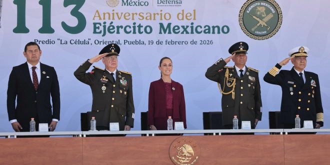 ORIENTAL, Puebla, 19 de febrero de 2026.- En el 113 Aniversario del Ejército Mexicano, la Presidenta Claudia Sheinbaum Pardo destacó que, en el contexto mundial actual, las Fuerzas Armadas son garantía de que México decide su destino con independencia y a cada uno de sus integrantes les recordó que el pueblo les reconoce su entrega, su valor, su lealtad y su servicio.