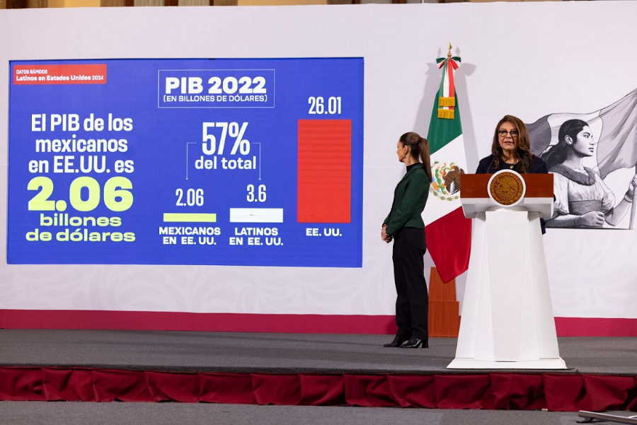 Ciudad de México a 23 de enero de 2025.- La Presidenta de México, Claudia Sheinbaum Pardo, reiteró que los mexicanos y mexicanas que viven en Estados Unidos aportan a la economía de las dos naciones, ya que, de acuerdo con el estudio Datos Rápidos: Latinos en Estados Unidos 2024 del Latino Donor Collaborative (LDC), los connacionales representan 2.06 billones de dólares en el Producto Interno Bruto (PIB) estadounidense, mientras que toda la población latina aporta 3.6 billones de dólares al PIB.