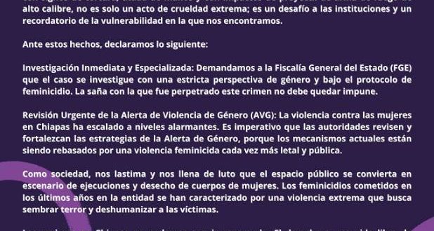 Revisión Urgente de la Alerta de Violencia de Género (AVG): La violencia contra las mujeres en Chiapas ha escalado a niveles alarmantes. Es imperativo que las autoridades revisen y fortalezcan las estrategias de la Alerta de Género, porque los mecanismos actuales están siendo rebasados por una violencia feminicida cada vez más letal y pública.