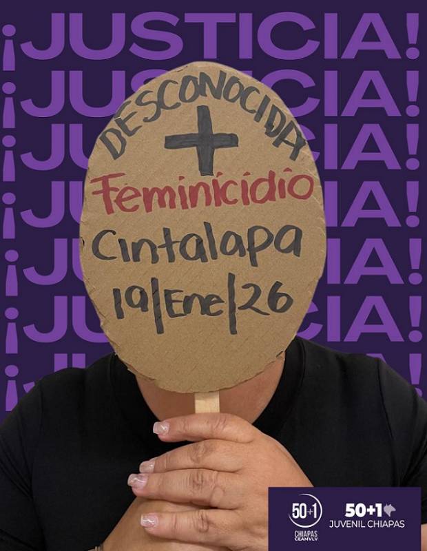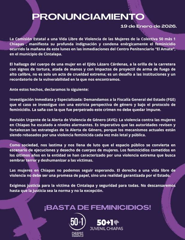 TUXTLA GUTIÉRREZ, Chiapas; 19 de enero de 2026./Chiapas en Contacto.-  La Comisión Estatal a una Vida Libre de Violencia de las Mujeres de la Colectiva 50 más 1, manifiesta su profunda indignación y condena enérgicamente el feminicidio ocurrido la mañana de este lunes en las inmediaciones del Centro Penitenciario “El Amate”, en el municipio de Cintalapa.
