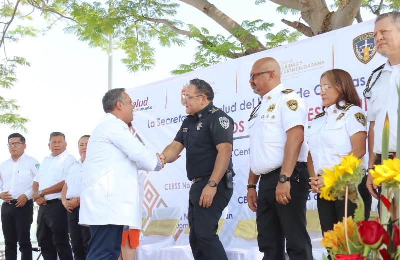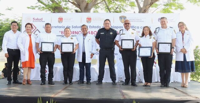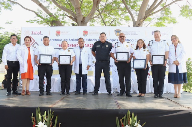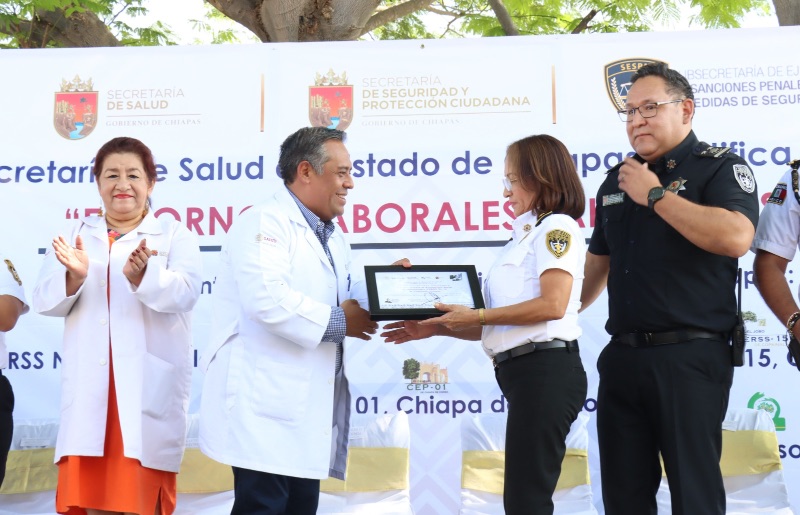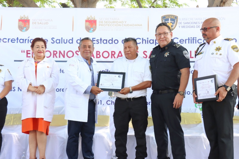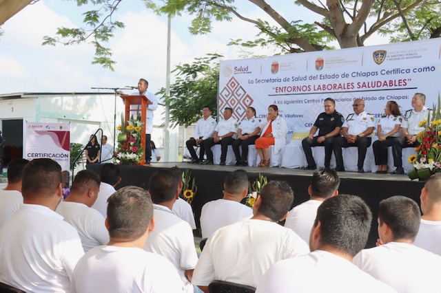 El encargado de la política sanitaria estatal, Francisco Mariscal, acompañado del subsecretario de Ejecuciones de la Secretaría de Seguridad y Protección Ciudadana (SSyPC), Comisario Jefe José Miguel Alarcón García, hizo entrega de los certificados al Centro Estatal Preventivo (CEP) número 01 de Chiapa de Corzo, los centros estatales de Reinserción Social de Sentenciados (CERSS) número 8 de Villaflores, número 10 de Comitán y 15 de Copainalá, así como el Centro de Internamiento Especializado en Adolescentes (CIEA) “Villa Crisol” de Berriozábal.