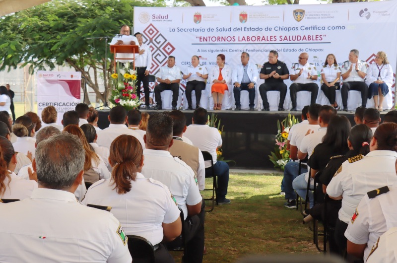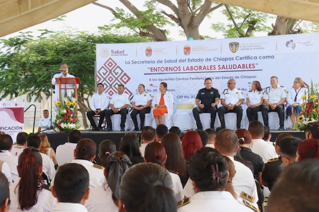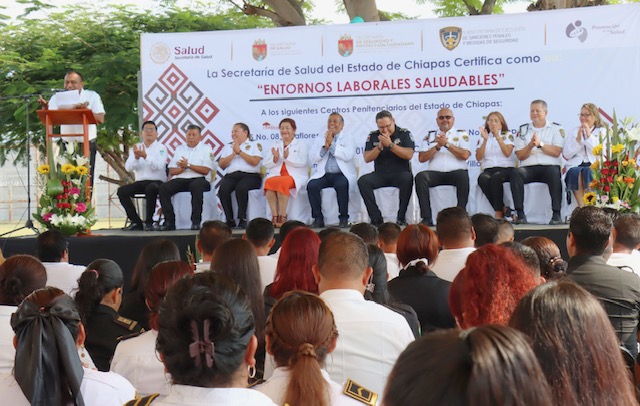 CHIAPA DE CORZO, Chiapas; 07 de noviembre de 2024.- En una suma de esfuerzos y voluntades para garantizar el desarrollo saludable de las personas privadas de su libertad, el secretario de Salud del estado, Francisco Arturo Mariscal Ochoa, encabezó la primera entrega de certificación de Entornos Favorables a la Salud de cinco centros penitenciarios, gracias a que estos espacios cumplen con los criterios correspondientes.