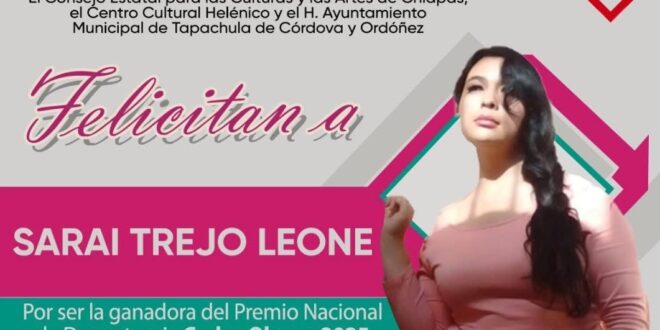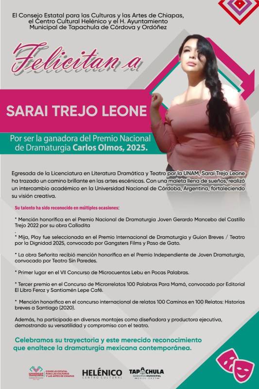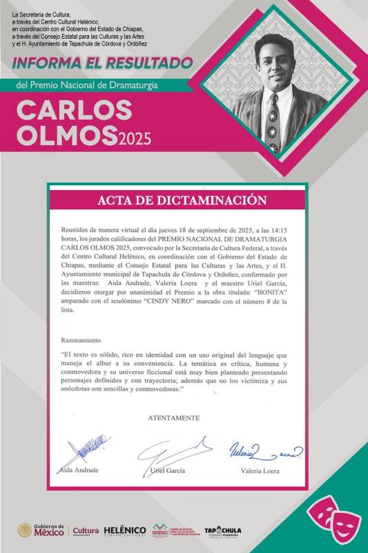 TUXTLA GUTIÉRREZ, Chiapas, 22 de septiembre de 2025.- Con la obra “Bonita”, presentada bajo el seudónimo “Cindy Nero”, Saraí Trejo Leone resultó ganadora del Premio Nacional de Dramaturgia Carlos Olmos 2025, concurso convocado por la Secretaría de Cultura, a través del Centro Cultural Helénico, en coordinación con el Gobierno del Estado, a través del Consejo Estatal para las Culturas y las Artes (Coneculta) y el Ayuntamiento de Tapachula de Córdova y Ordóñez.