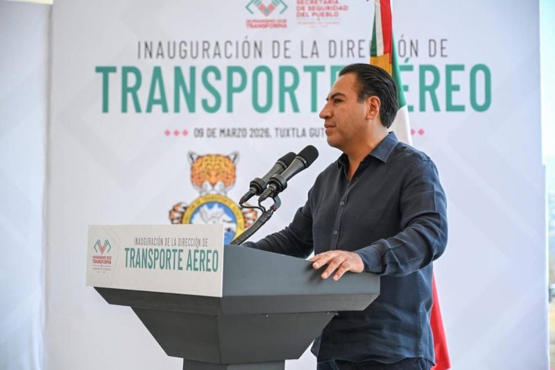 TUXTLA GUTIÉRREZ, Chiapas, 09 de marzo de 2026.- El gobernador Eduardo Ramírez Aguilar encabezó la inauguración de la Dirección de Transporte Aéreo de la Secretaría de Seguridad del Pueblo (SSP), un espacio operativo que contribuirá a reforzar de manera integral la seguridad en Chiapas. En este marco, destacó que con estas acciones se fortalecen las labores de vigilancia, reacción y apoyo a las estrategias de seguridad, lo que permite ampliar la capacidad institucional para proteger al pueblo chiapaneco.