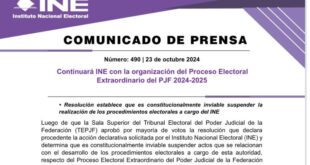 Resolución establece que es constitucionalmente inviable suspender la realización de los procedimientos electorales a cargo del INE. CIUDAD DE MEXICO, 23 de octubre de 2024./Comunicado Oficial Número 490.- Luego de que la Sala Superior del Tribunal Electoral del Poder Judicial de la Federación (TEPJF) aprobó por mayoría de votos la resolución …