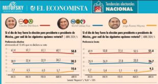 CIUDAD DE MEXICO; Miércoles 24 de abril de 2024.-A escasos 40 días de las elecciones, la morenista Claudia Sheinbaum sigue encabezando las preferencias electorales (58.8%); Xóchitl Gálvez (30.5%) y el emecista Jorge Álvarez Máynez (10.6%) se mantienen en segundo y tercer lugar. La encuesta nacional Mitofsky Tendencias electorales rumbo al …