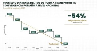 CIUDAD DE MEXICO; 25 de noviembre de 2025.- La Estrategia Nacional de Seguridad impulsada por los gobiernos de la Cuarta Transformación, que hoy encabeza la Presidenta Claudia Sheinbaum Pardo, redujo en 54 por ciento el promedio diario de robo a transportista con violencia en los últimos siete años, lo que …