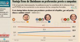 CIUDAD DE MEXICO, 23 de febrero de 2024./Por Rolando Ramos.-A una semana de que inicien las campañas de manera formal, Claudia Sheinbaum, candidata de la coalición de Morena, PT y PVEM a la Presidencia de la República, se mantiene en el primer lugar de las preferencias electorales con 51.6%; le …